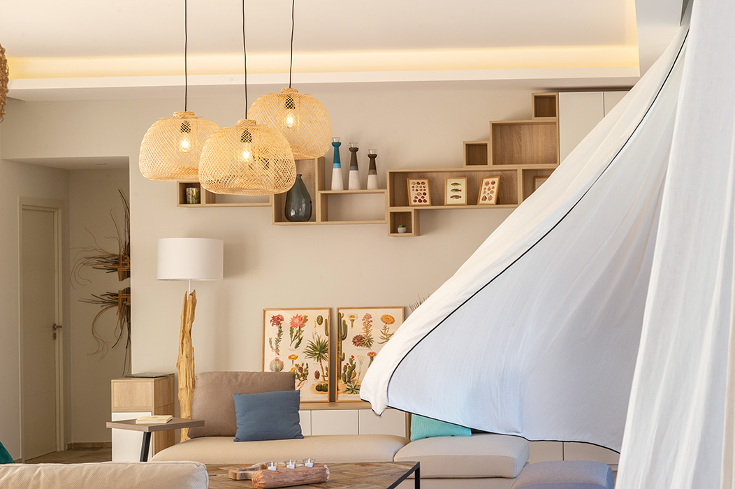L’agence a dessiné une grande composition murale pour intégrer de façon esthétique la tv dans un ensemble de niches de différents dimensions. L’ensemble est également fonctionnel et adapté aux besoins de la famille. Les matériaux ont été choisis pour s’harmoniser avec l’esprit naturel désiré par les clients.